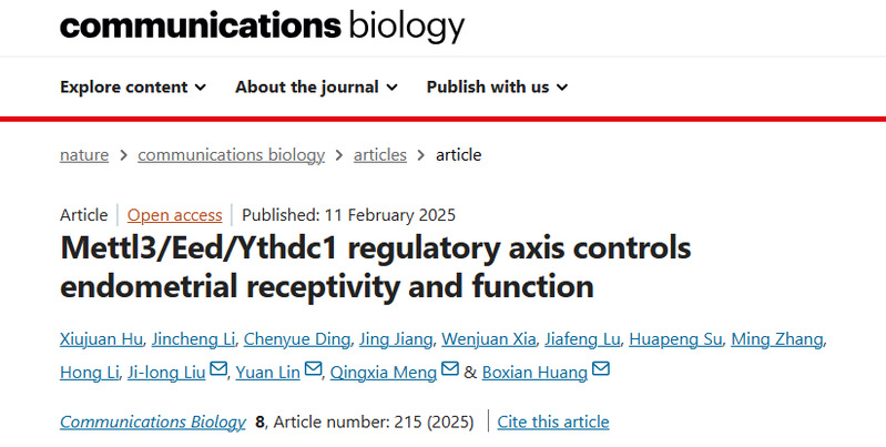 近日,南京医科大学姑苏学院黄伯贤教授、孟庆霞教授在《自然》旗下期刊《通讯生物学》(Communications Biology)发表题为“Mettl3/Eed/Ythdc1信号轴调控子宫内膜容受性与功能(Mettl3/Eed/Ythdc1 regulatory axis controls endometrial receptivity and function)”的研究论文,揭示了RNA m6A甲基化修饰与组蛋白修饰在调控子宫内膜容受性中的关键作用及分子机制,为理解反复种植失败(RIF)的病因及开发新的诊疗策略提供了重要理论依据。