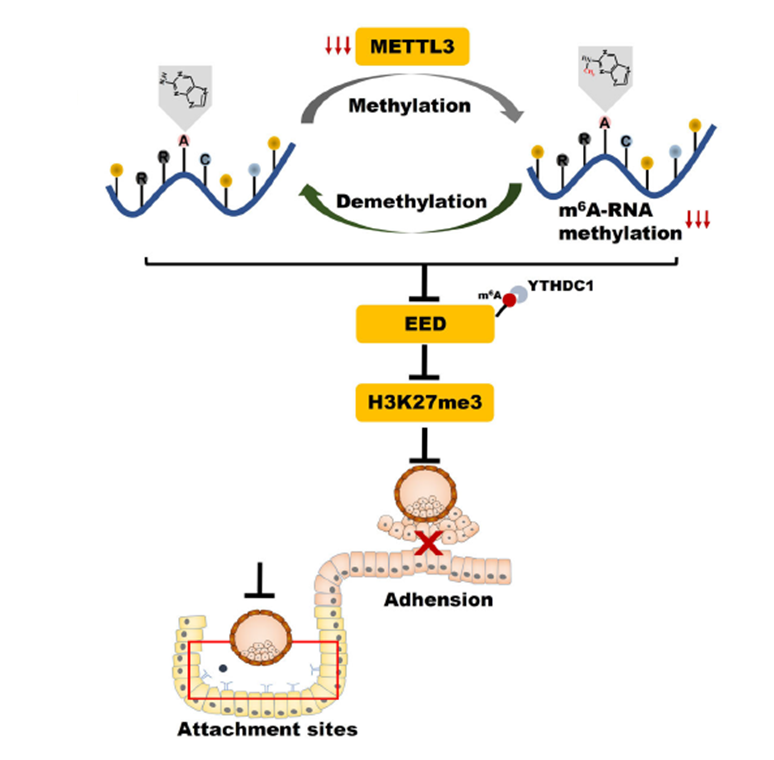 该研究发现,RIF患者及模型子宫内膜组织中关键RNA m6A甲基转移酶METTL3的表达及m6A整体甲基化水平显著降低。利用条件性基因敲除小鼠模型和细胞模型,证实子宫内膜特异性缺失Mettl3会导致小鼠子宫内膜结构异常、功能受损、生育力显著下降。机制研究表明,METTL3通过其催化的m6A甲基化修饰,招募并调控关键组蛋白修饰复合物PRC2的核心组分EED。METTL3缺失导致EED转录本上的m6A修饰减少,进而削弱了m6A“阅读器”YTHDC1对EED的识别和结合。诱发H3K27me3水平的降低并改变了染色质的可及性,最终导致子宫内膜容受性关键基因(如LIF、HOXA10、HAND2等)的异常表达。
