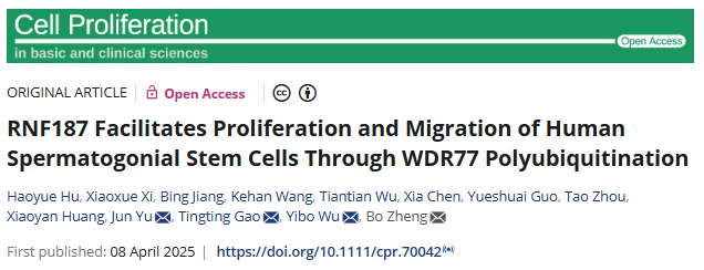 近日,南京医科大学姑苏学院郑波副研究员在《细胞增殖》(Cell Proliferation)期刊发表题为“RNF187通过WDR77多聚泛素化促进人精原干细胞增殖与迁移(RNF187 Facilitates Proliferation and Migration of Human Spermatogonial Stem Cells Through WDR77 Polyubiquitination)”的研究论文,揭示了蛋白质泛素化修饰调节人类精原干细胞命运决定的关键机制,为理解男性不育的病因提供了新见解。
