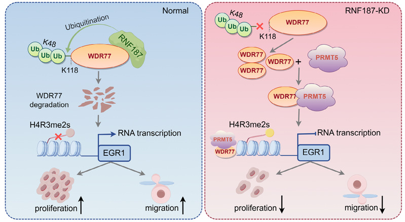 机制研究发现,RNF187通过赖氨酸48型(K48)连接的多聚泛素化修饰特异性识别WDR77的K118位点,并介导其经泛素-蛋白酶体系统(UPS)降解。进一步研究发现,WDR77表达下调导致其互作蛋白——精氨酸甲基转移酶PRMT5催化的组蛋白H4第3位精氨酸对称二甲基化修饰(H4R3me2s)水平降低,进而解除对早期生长反应蛋白1(EGR1)的转录抑制。EGR1作为维持人SSCs功能的正向调控因子,其表达激活对干细胞稳态至关重要。